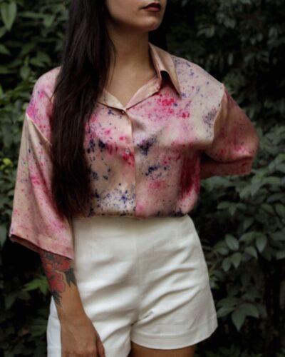 Each textile and creation is one of a kind, hand-dyed by Theodora, using natural materials such as plants, minerals, and food waste.The harvest and color palette depend on the season: flowers and tree leaves in the spring, barks and roots in the fall. Unique color palette of prints and patterns are created by dye baths, pressure, steaming and other ancient techniques.