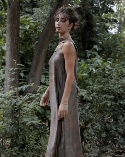Maxi silk dress, naturally & hand dyed by Theodora. V neckline & low open back.